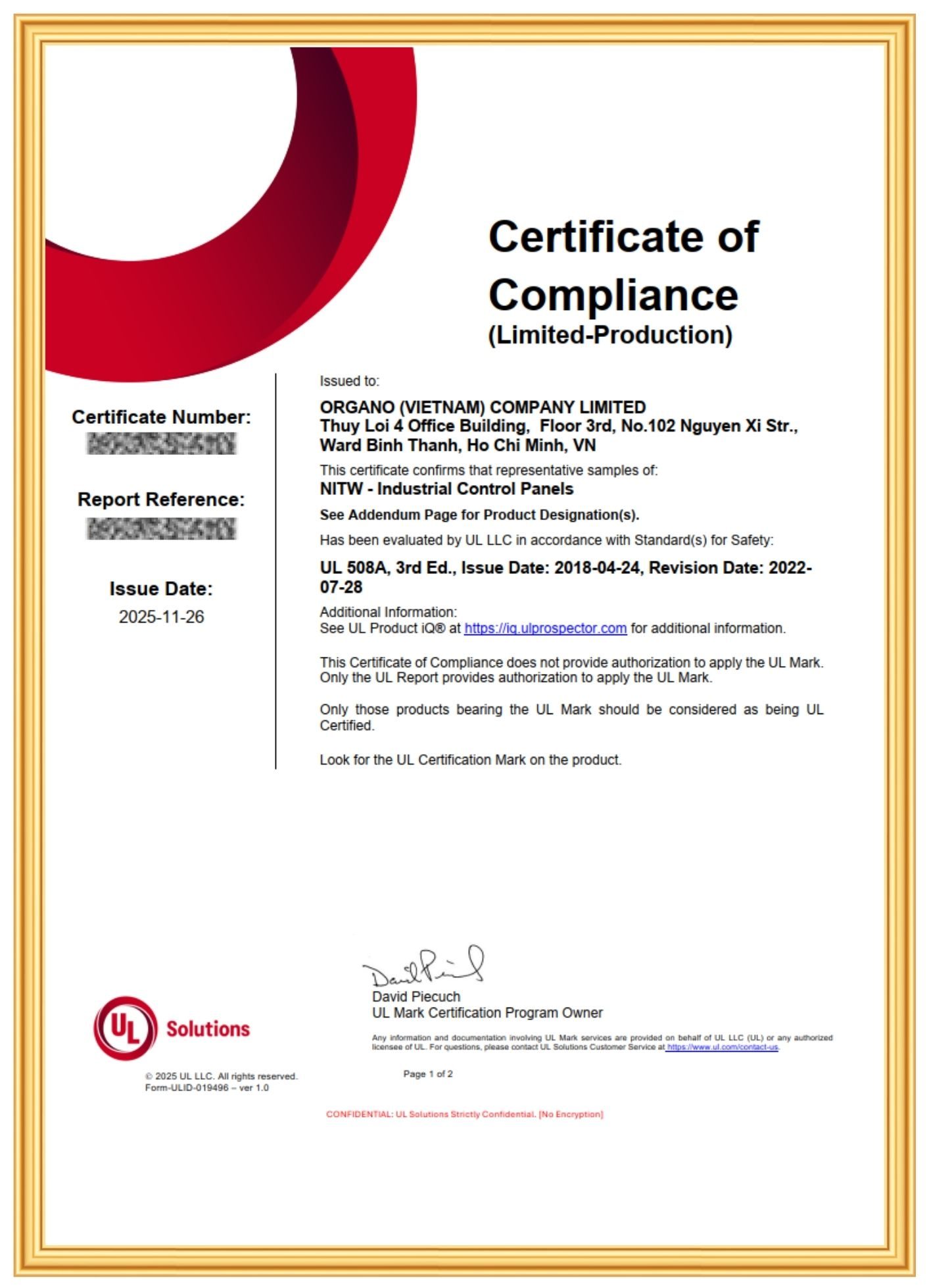 ORGANO MILESTONE: THE FIRST COMPANY IN VIETNAM TO ACHIEVE UL LISTED CERTIFICATION (UL 508A) FOR INDUSTRIAL CONTROL PANELS – A TECHNICAL PASSPORT TO GLOBAL MARKETS