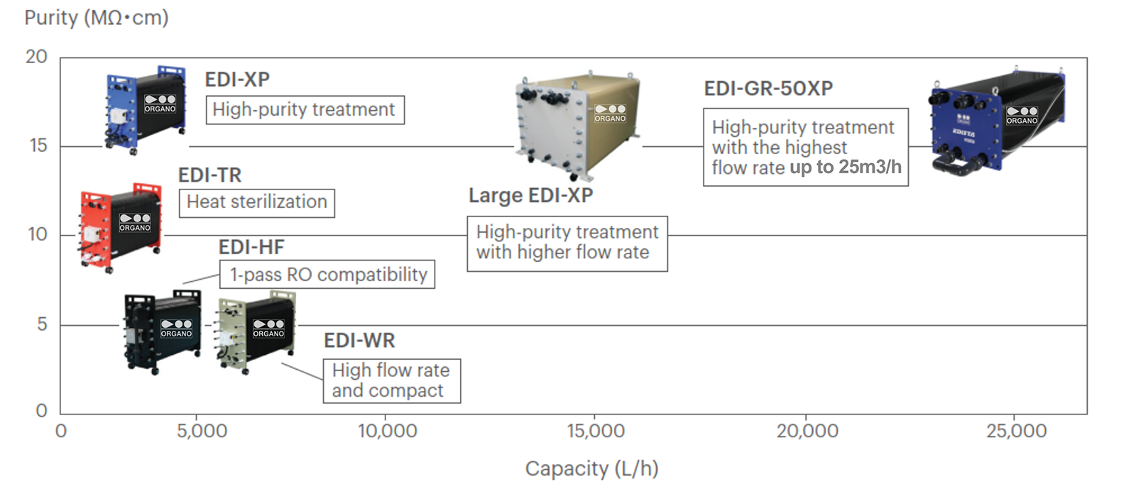 The Organo EDI system, exclusively developed by Organo Corporation, provides a high rate of purified water for applications such as pharmaceuticals, semiconductors, electric products, and boilers, etc. and is available in an extensive lineup of types to meet diverse needs.