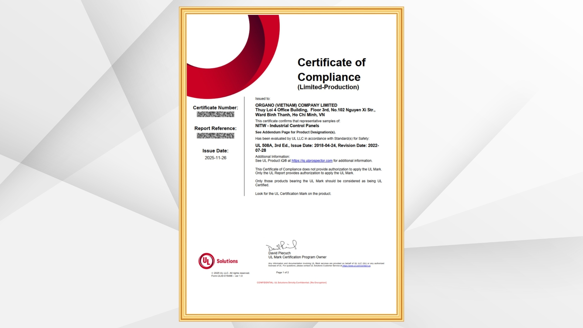 DẤU ẤN ORGANO: ĐƠN VỊ VIỆT NAM ĐẦU TIÊN ĐẠT CHỨNG NHẬN UL LISTED (UL 508A) CHO HỆ THỐNG TỦ ĐIỆN – TẤM HỘ CHIẾU KỸ THUẬT VƯƠN RA THỊ TRƯỜNG QUỐC TẾ