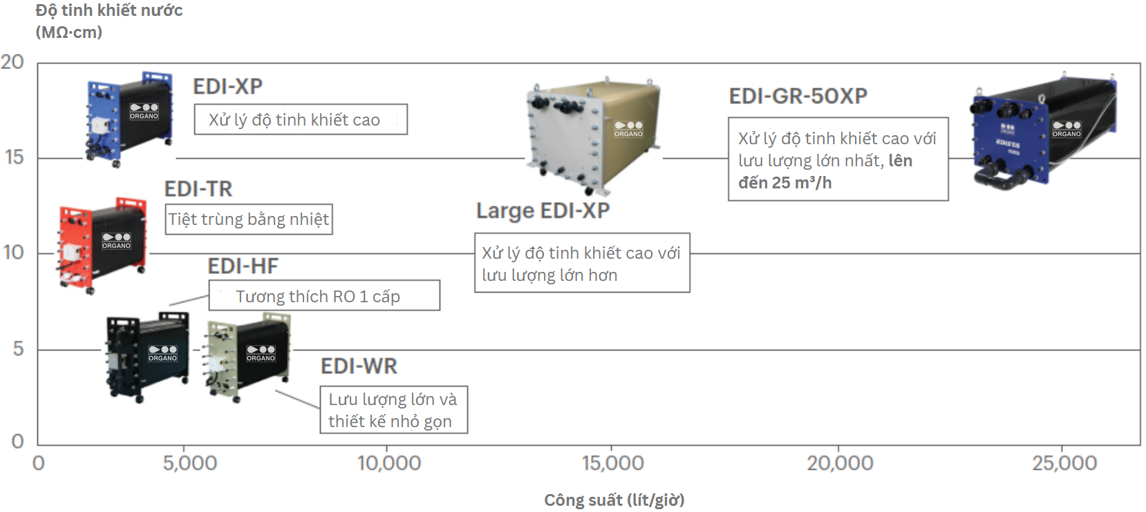 Hệ thống EDI của Organo, được phát triển độc quyền bởi Tập đoàn Organo, cung cấp nước tinh khiết với hiệu suất cao ứng dụng trong dược phẩm, bán dẫn, sản phẩm điện tử, nồi hơi,… và có nhiều chủng loại đa dạng để đáp ứng các nhu cầu khác nhau của khách hàng.